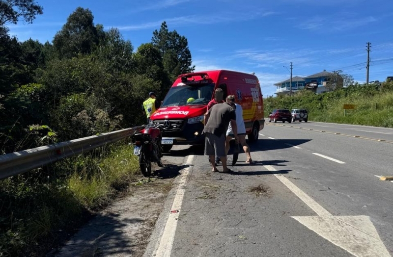 Jovens ficam feridos após queda de moto na SC-418 em São Bento do Sul
