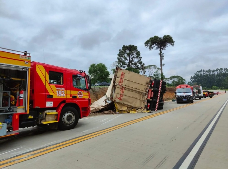 Um grave acidente mobilizou equipes de socorro na manhã desta quarta-feira (5) na localidade do Salseiro, em Canoinhas. Por volta das 8h20, um caminhão saiu da pista e tombou na altura da SC-477. O condutor, um homem de 63 anos, ficou preso mecanicamente pelo volante, que pressionava seus membros inferiores contra a cabine.