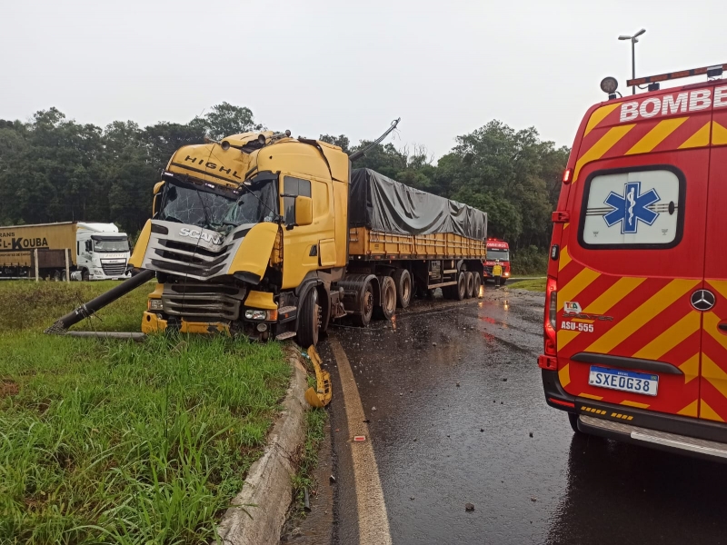 Ao chegarem ao local com as viaturas ABTR-79 e ASU-555, os bombeiros encontraram um caminhão Scania amarelo em situação crítica: a cabine (cavalinho) estava parcialmente fora da rodovia, enquanto a carreta bloqueava o trevo principal. O veículo passou direto pelo cruzamento, colidindo violentamente contra um poste de iluminação.