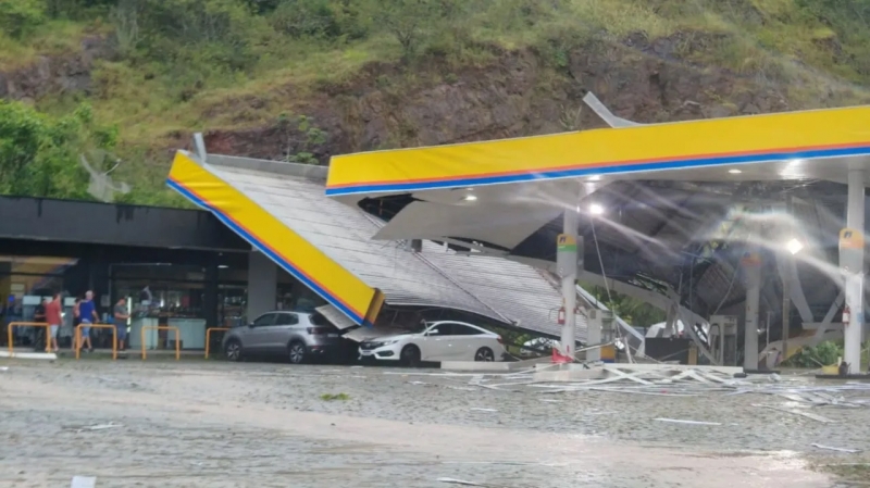 O mau tempo que cruzou o estado na tarde desta quinta-feira (8) deixou centenas de imóveis danificados e vias inundadas. Segundo registros, o temporal impactou cidades de quatro grandes regiões catarinenses. Em Gaspar, no Vale do Itajaí, as câmeras de segurança de um posto de gasolina registraram o instante em que as rajadas de vento removeram toda a estrutura do teto.