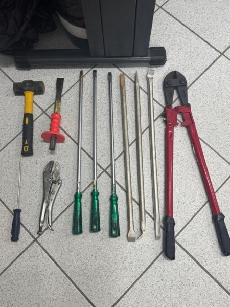 No interior da loja, os policiais encontraram sacos já abastecidos com produtos eletrônicos prontos para o transporte. Além da mercadoria recuperada, foi apreendida uma bolsa de couro contendo o "kit de arrombamento" utilizado pela dupla, composto por: