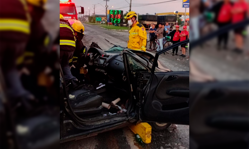 Na madrugada deste domingo, 12 de abril de 2026, um grave acidente de trânsito mobilizou diversas frentes de socorro na BR-280, nas proximidades do Posto Apollo, em Araquari. Por volta das 05h52, o trem de socorro do Corpo de Bombeiros Militar, composto pelas viaturas ASU-552 e ABTR-57, foi acionado para prestar apoio aos Bombeiros Voluntários da cidade em uma colisão frontal envolvendo um Honda Fit e um Ford Ka.
