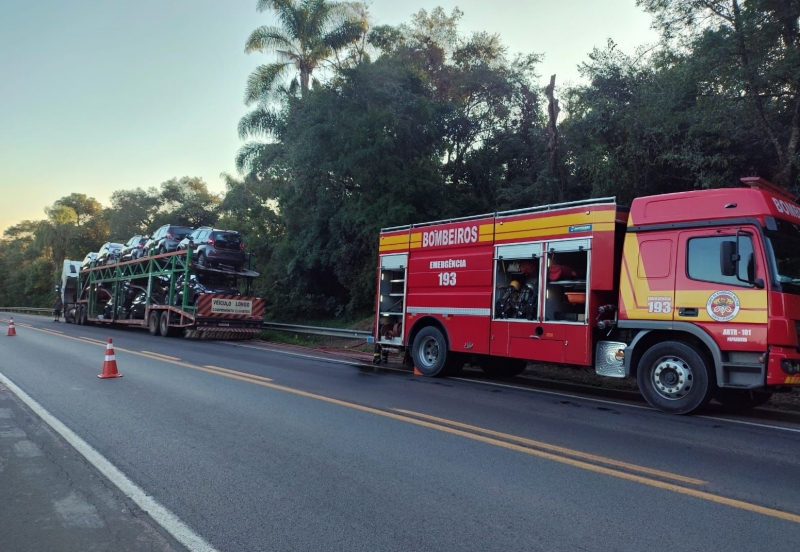 Princípio de incêndio em carreta cegonha mobiliza Bombeiros na BR-116 em Papanduva