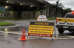 Bloqueio na SC-418 acontece na altura da Curva do Mirante para limpeza da pista; interrupção no tráfego deve durar 10 horas.